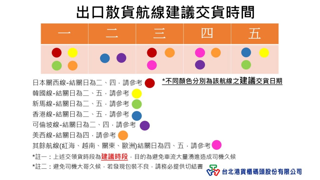 出口散貨航線建議交貨時間, 請參考各航線日期及示意圖 日本關西線-結關日為二、四 韓國線-結關日為二、五 新馬線-結關日為二、五 香港線-結關日為二、五 可倫坡線-結關日為二、四 美西線-結關日為四 其餘航線(紅海、越南、關東、歐洲)結關日為四、五 *註一:上述交領貨時段為建議時段,目的為避免車流大量湧進造成司機久候 *註二:避免司機大哥久候,若發現包裝不良,請務必提供切結書