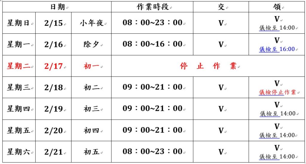 - 除夕(2/16)作業時段08:00 ~ 16:00。