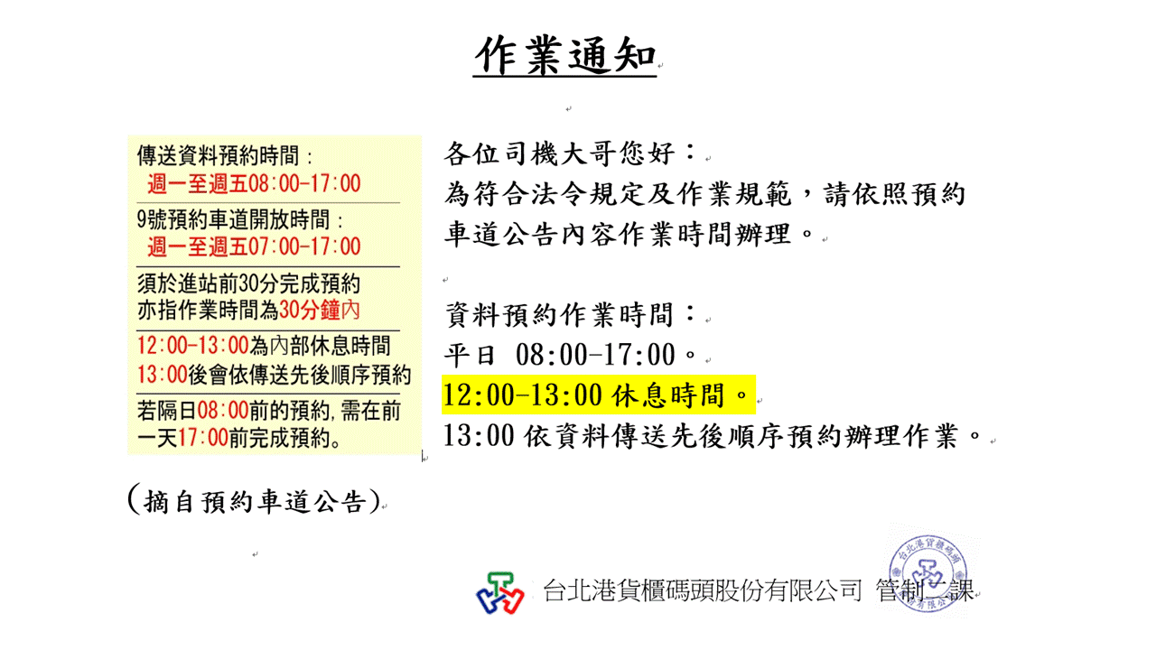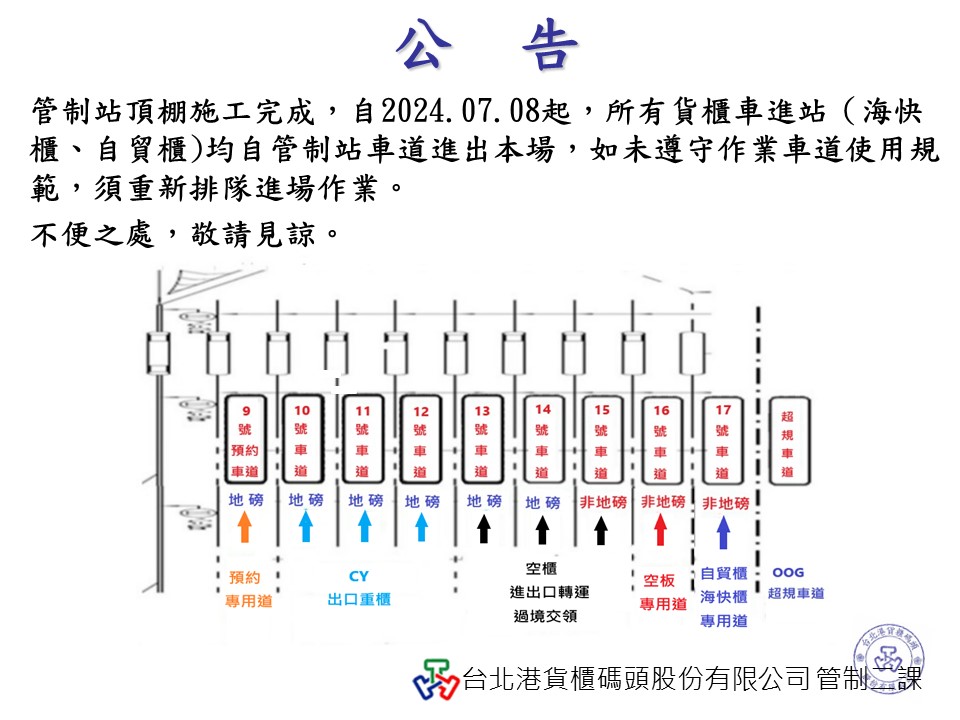 - 提領CY進口重櫃請事先確認是否需先執行海關儀檢,應儀檢櫃須在海關儀檢作業時段內完成。