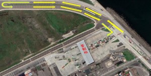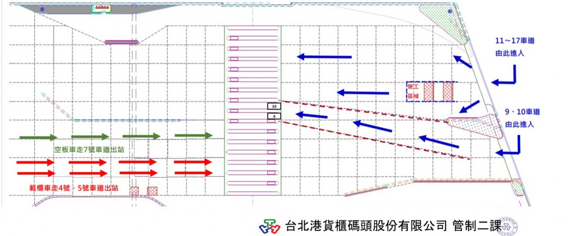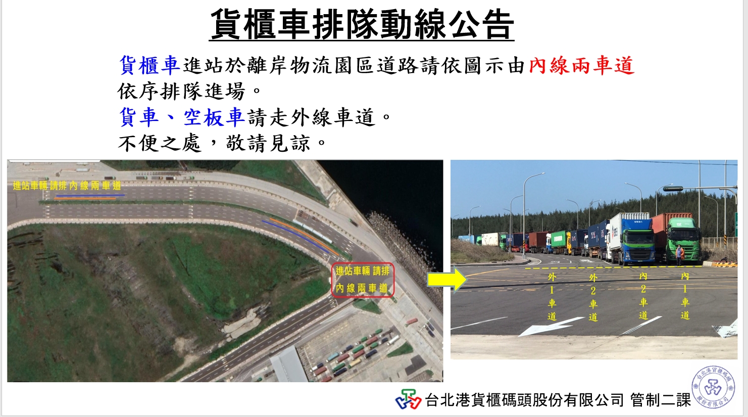 出站載櫃車請由下方路線從4號及5號車道出站。