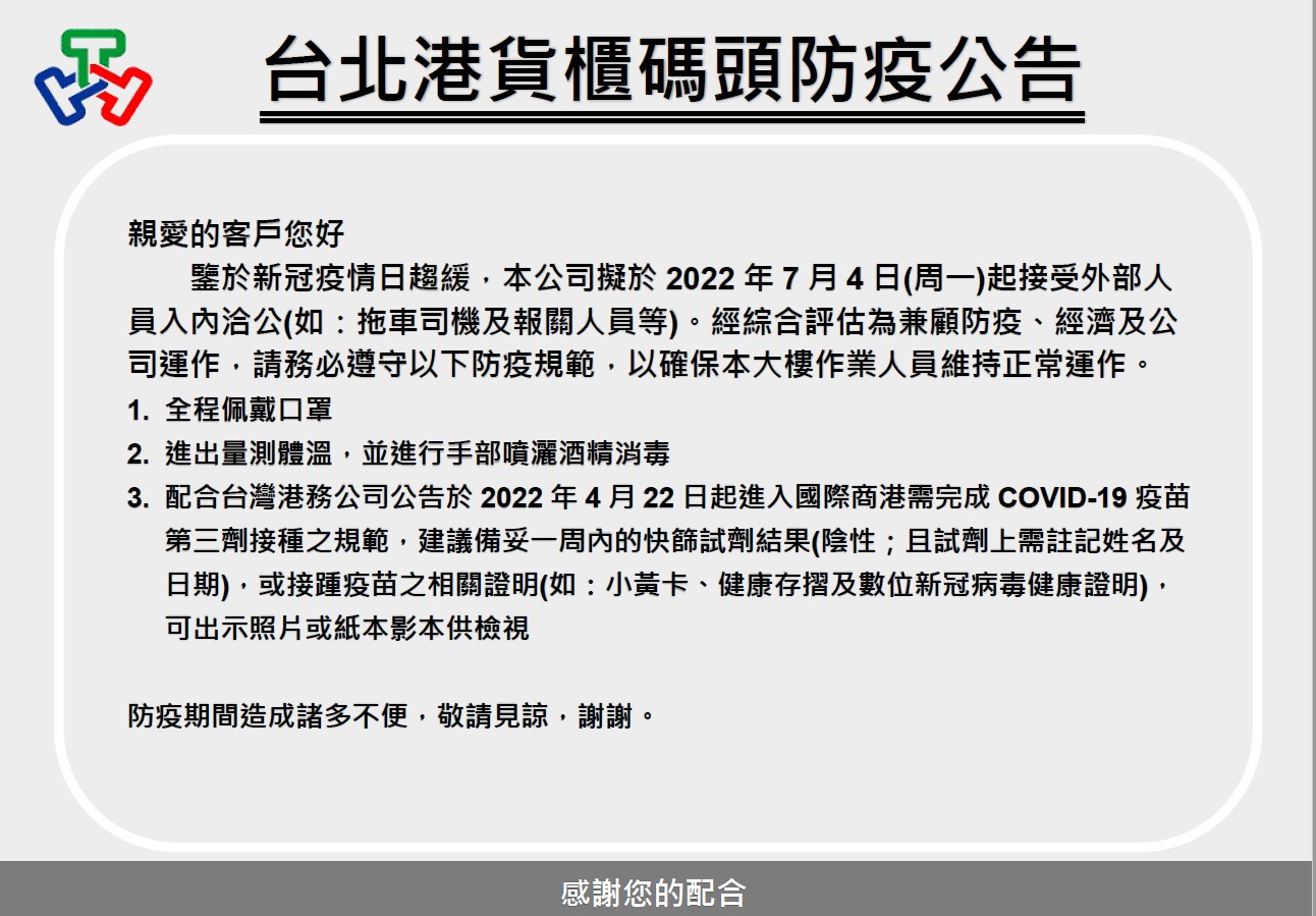 鑒於新冠疫情日趨緩、本公司擬於2022年7月4日周一起接受外部人員入內洽公(如:拖車司機及報關人員等).