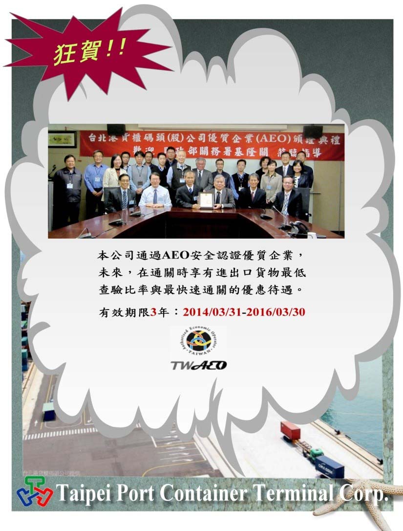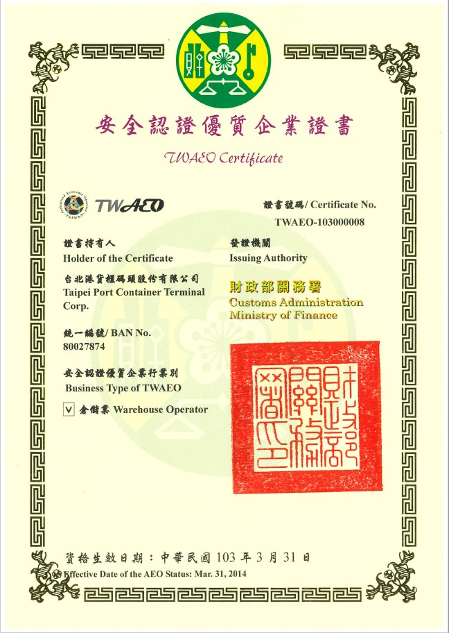 本公司於2014年03月31日通過財政部關務署頒部之AEO認證,可提升本公司企業形象並符合相關法規及滿足對客戶整體貨物安全之要求,亦為整體商業夥伴之供應鏈盡一份心力。